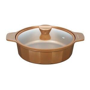 落ち着きのあるゴールドカラーが、いつもの食卓を豊かに。サイズ約 幅35.5×奥行28×高さ13(cm)鍋の深さ:約8cm底の厚さ:約3.6mm重量約 1.8kg容量満水容量:4.3L内容量1個材質本体:アルミニウム合金表面加工:内面ふ...
