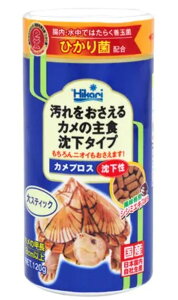 “ひかり菌”と茶葉の効果で水の汚れと臭いを抑えるカメの総合栄養食です。(甲長38cm) 【特長】 ●深い水でカメを飼育する際に、食べやすい沈下性。 ●カメが好むシジミエキス配合。 ●ひかり菌のプロバイオティクス効果と茶葉の消臭