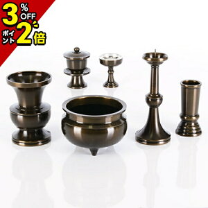 商品説明鍋長色の深い色合いが、上品な存在感を演出する銅器仏具です。緑がかった黄色の地色に、黒色のボカシを施した、趣きのある輝きが印象的です。花立・前香炉・灯立・湯茶器・仏器・線香差の6点セットです。 商品サイズ 3.0寸 高さ