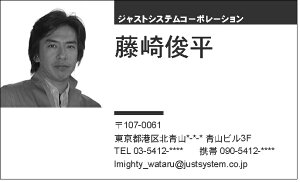 名刺に、35mm×35mmまでの大きさの 写真を入れることができます。 ※範囲内でしたら、写真のサイズ変更は可能です。 見本は顔写真ですが、お好きな画像を入れていただけます。 文字の内容・位置・大きさ・書体は、お好きに変更できます。