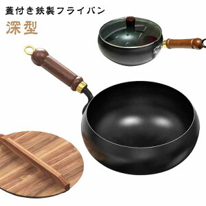 【深型】【蓋付き鉄製フライパン】耐久性が高く長持ちするフライパンです。深型で少ない油で揚げ物も!握りやすく、熱くなりにくい、天然木製の取っ手も装備。木製の蓋も備えていますので、360度密閉することで美味しさを保持します。