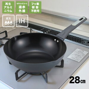 IH対応の解説 リサイクルアルミを使用した、フッ素樹脂不使用の人と環境に優しい深型フライパン。 大人数の料理におすすめな28cmサイズ。コンパクトで使いやすく、IH・ガス火のどちらの熱源にも