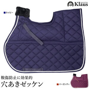 商品説明 き甲の部分に鞍傷防止のための穴があけられた、Klausの穴あきゼッケンです。 穴の左右には、付属の厚手のクッションパッドを収納できます(着脱可)。縁の部分に施されたロープラインが、ほどよいアクセントとなっています。