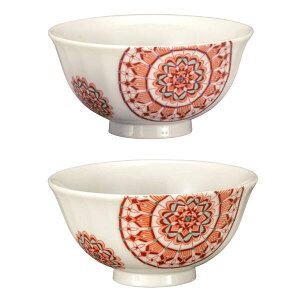 九谷焼金ラベル(素地:石川県産、加飾:九谷焼産地) 素材:磁器 サイズ: (小)径10.8cm×高さ5.5cm (大)径11.6cm×高さ5.9cm 箱:化粧箱 作:大志窯 繊細な筆使いがとても美しい赤絵丸紋の組飯碗です。シリーズでご...
