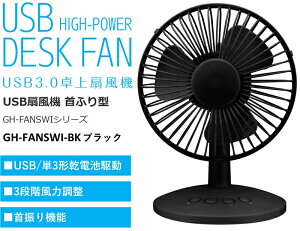 GH-FANSWIシリーズ GH-FANSWI-BK ブラック USB扇風機 首ふり型 USB/単3形乾電池駆動 ●USB接続の強力デスク用扇風機 ●自動首振り機能搭載 ●3段階の風力調節 ■自動首振り機能搭載...