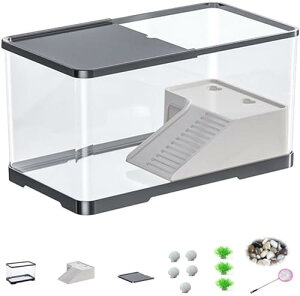 M:39*21.5*21cm L:55*30*29.4cm 材質:プラスチック セット内容:水槽本体+蓋+滑り台+貝殻*5+水草*3+ネット+玉石200g(13点セット) 適合した種類:両生類、リクガメ、半水棲ガメなど 【蓋付きデザイ...