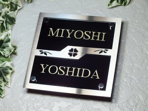 表札 二世帯 クローバーデザインのステンレス切り抜きとブラックガラスが高級感を出し、ワンランク上の表札を奏でます。 サイズ 横155mm×縦155mm×全体の厚み8mm ステンレスはヘアーラインを使用し...