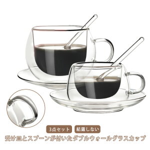 受け皿とスプーンが付いたダブルウォールグラスカップ。【3点セット】熱をキープする二重構造!ダブルウォールの空気の層が断熱効果を発揮し、冷たさ温かさをより長くキープします。冷たいものを入れても表面に水滴がつきにくい構造で