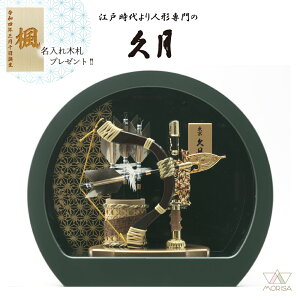 ◆ 破魔弓 カーキ塗円形 アクリルケース 太刀 円形翠玉 久月 サイズ:横幅35×奥行17×高さ30cm 目を引くのは、月や円窓を思わせる優美な弧を描いたケースデザイン。落ち着いた深緑色のフレームが、格調高い雰囲気を醸し出します。 ケースの