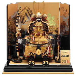 サイズ:間口75×奥行50×高さ73(cm)節句人形優良店利光監製 四神大鎧 正絹緋糸褄取縅 8号 四神山水塗屏風。