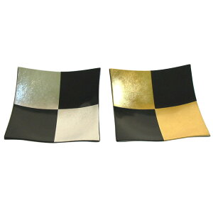 ギフトラッピングについて 「吹上ペア皿 金銀市松」解説 金銀の市松模様が華やかさを演出するペアのお皿。 四隅のせり上がった「吹上皿」という形ですが、よく見かけるものよりも、より斬新で独特なフォルムが特徴。 金銀の箔で市松を
