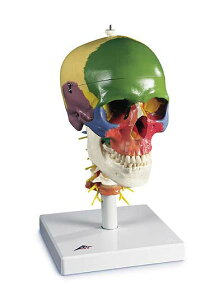 19色のカラーを使用し頭蓋骨の構成を理解し易いようになっています。 隣り合う骨は違う色で区別され頚椎部もC127番を着色しました。 延髄脊髄神経椎骨動脈脳底動脈も付いています。 頚椎は屈曲自在 スタンド付。 【1105送料無料-s】■キャ