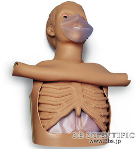 頭部、頚部、顎などの関節は忠実に作られ、頭部の傾け、顎の持ち上げ、下顎の突き出し、頚部の伸展等の自然な動きを再現できます。 胸腔内には胸郭、肺、心臓などが実物同様に付いており、ハイムリック法の練習もできます。 頭部を前