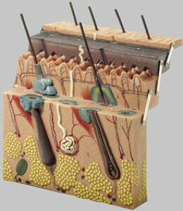 約70倍大、ソムソープラスティック製 4分解、台付 皮膚の層は動かせます。 髪の毛の最初の原基痕跡(発育が 不全又は退化したもの)、汗腺、皮膚 の感覚器官を見せている。 高さ:27cm、幅:33cm、奥行:15cm 重量:1.8kg ...