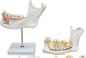 このモデルは青年の左側下顎を表示しています。下顎骨の一部が取り外し可能で歯根海綿質血管神経などを見る事ができます。さらに犬歯と第1大臼歯は2分解でき取り外し可能。 35x18x36cm スタンド付 キーカード(解説書)付属 下顎開放型の頭