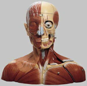 実物大、ソムソープラスチック製 ,19分解 スタンド台付 右側は深在筋を含んだ筋肉組織を示しています。 左顎関節と胸鎖乳突筋は取り外し可能で頸動脈三角 を見ることが出来ます。 僧帽筋、大胸筋、三角筋と鎖骨は取り外し可能です。 全体