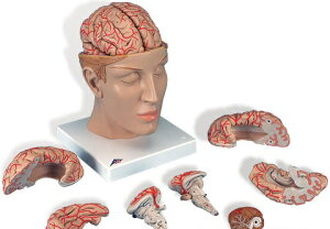 頭部は頭蓋底の上から水平断され開放しています。脳は取り外し可能なので頭蓋内の位置が分かります。正中矢状断された8分解の脳モデルでは脳表面の動脈の様子を頭蓋底では脳底動脈や静脈洞を見る事ができます。左右両半球とも分解単位
