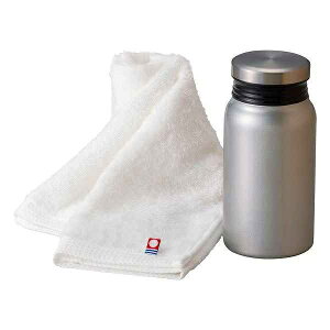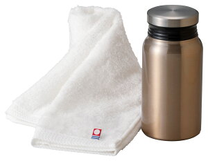 ボトル(容量=約380ml)・フェイスタオル各1 ●口径=約4.5cm ●素材 ボトル本体=ステンレス、フタ=ステンレス・シリコ-ンゴム・ポリプロピレン、フェイスタオル=綿100% ●現品(ボトル)約7.5cm(直径)×15.5cm...