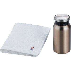 のも飲み頃温度を保ちます。 やわらかさと吸水性に優れた今治タオルとのセットです。 ■ボトル(容量=約380ml)・フェイスタオル各1 ■箱サイズ:17×17×8 【用途】引出物...