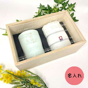 美濃焼カップ(名入れ)×1個 今治ハンドタオル×1枚 刻印入りアクリル蓋つきボックス 商品情報 [カップ] 容量:250ml 重量:約170g 素材:磁器 生産国:日本 [タオル] 素材:綿100% 生産国:日本...