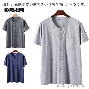 夏用、着脱やすい前開きの介護半袖Tシャツです。通気性の良い生地でサラリと快適な着心地。開閉が可能なボタン仕様で、着替えが楽です。療養中の方、お年寄りの方に優しい着心地を提供します。見た目もオシャレでお部屋着にも最適なデ