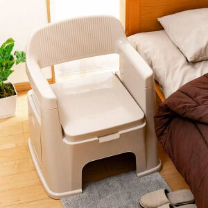 リハビリや介護をサポートする簡易洋式トイレ。 ベッドサイドや室内に置いても場所を取らないコンパクトな設計、持ち手付きで移動もラクラクです。 準備も簡単で、水と消臭剤をバケツに入れてセット完了。使用後はバケツを本体から取り外してトイレに流