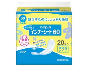 「ネピア インナーシート60 20枚入」は、わずか2.5mmの薄さでも安心の吸収力、装着時にも目立たない自然なつけ心地の尿もれ用シート・パッドです。後部まで優しく包み込むロングサイズ。体のラインにしなやかにフィットし横漏れをガード