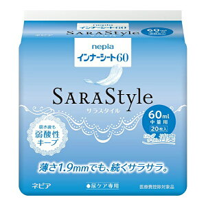 「ネピア インナーシート60 20枚入」は、わずか2.5mmの薄さでも安心の吸収力、装着時にも目立たない自然なつけ心地の尿もれ用シート・パッドです。後部まで優しく包み込むロングサイズ。体のラインにしなやかにフィットし横漏れをガード
