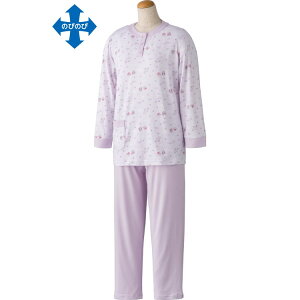 介護 長袖 大きめ釦 パジャマ上着のみ フラワー柄 綿混 婦人