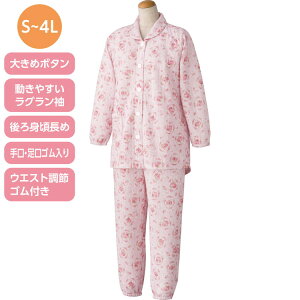 【ウエスト下からふんわり広がるシルエットがリラクシーならくちんパジャマ】ワンタッチで着替えも簡単!ボタン裏を面ファスナーにすることでサッと留められるらくちんパジャマです。ウエスト下をギャザーで切り替え、ゆったりリラックスした印象に。袖...