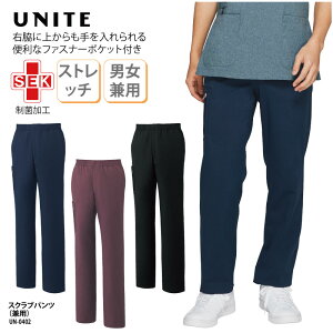 スクラブパンツ(男女兼用):UN-0402 ■商品説明 コーディネートしやすい無地パンツ。 右脇には上からも手を入れられる便利なファスナーポケット付き。 工業洗濯対応の高い耐久性に加え、制