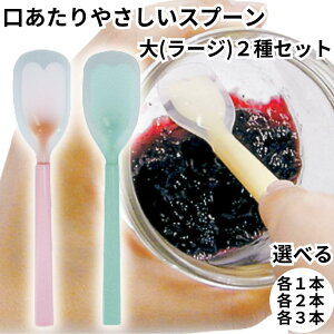 口あたりやさしいスプーン ラージサイズ(大) ピンク・ブルー 口元や歯茎へのあたりがやさしいスプーンです【2種セット】 シリコンゴムの中にコシのあるナイロン樹脂の芯を埋め込んだ新しいスプーンです。 先端は柔らかなシリコンゴム