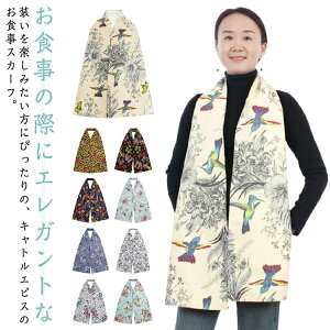 お食事の際にエレガントな装いを楽しみたい方にぴったりの、キャトルエピスのお食事スカーフ。日々の暮らしの中で、食事のシミや汚れから大切な衣類をさり気なく守ってくれる洋服ガード。ストールのように首からさっと羽織るだけで食