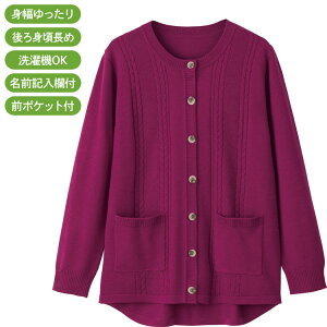 ●素材/ポリエステル50%、ナイロン25%、アクリル20%、毛5%●生産国/中国●洗濯機可●乾燥機可(60℃まで)●大きめボタン&斜めボタンホール●身幅ゆったり●後ろ身頃長め●前ポケット付き●名前記入欄付き●婦人用・やさしい機能