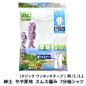 紳士7分袖前開きシャツ(ワンタッチテープ式)の紹介ワンタッチテープ(マジックテープ/面ファスナー)で前開きになる、メンズ(男性・紳士)用 ワンタッチの肌着です。身体が不自由な方や高齢(お年寄り)の方、自分で脱着するのも困難