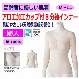 介護 8分袖 ソフトカップ付き M L LL アロエ加工 春夏秋冬 インナー シャツ 介護用 肌着 介護下着 高齢者 女性 シニア 胸の形をきれいに整えるカップ付き。8分袖で冷えを軽減。<b...