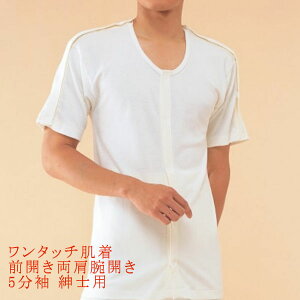 ワンタッチ肌着 前開き両肩腕開き5分袖 前開きで、しかも肩から腕にかけても、マジックテープで開く肌着です ◎ワンタッチ肌着◎ ボタンをかける手間を全面解消した、丸型マジック式ボタン肌着。 [肌へのやさしさ] 品質の基本は素材にこ