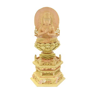 六角台座の大日如来の仏像です。 金泥書きを付ける事が出来ます。 【金泥書き】金粉を入れた泥で仏像の衣の上を塗るかたちになります。 ぱっと見ただけでは、見分けは付きにくいとも言えますが、仏像の衣の部分を...
