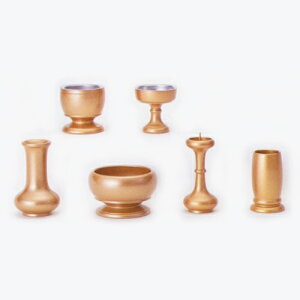 美しい曲線で構成され、上品な色あいのピンク色でお仏壇を優雅に彩ってくれます。素材は金属製で適度に重さもあり、金物のモダン仏具の中では、お求め安い価格になっております。花立・灯立・香炉・仏器・茶器・線香差の6点セットです。