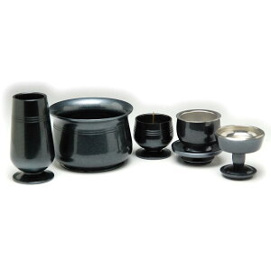 売です。(満杯ではなく適量) 黒色の仏具5点です。香炉・花立て・火立て は4寸です。 4寸の仏具ですが、仏器(ご飯)と湯呑みは3寸サイズの黒色仏具セットと同じサイズです。 香...
