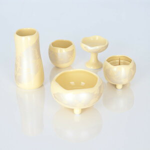 かわいらしくシンプルなデザインの仏具セット。 キャビネットなど台の上に載せるタイプの上置仏壇や 細身の床置きタイプの小型モダン仏壇に合う少し小さめの仏具。 火立て、花立、香炉、仏飯器、茶器と主要な仏具5点のセットです...