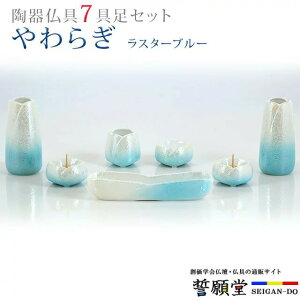 やわらぎ ラスターブルー 7具足セット 商品説明 花びらの形が優雅な、優しい色合いの陶器仏具です。陶器なので錆びや汚れに強く、実用的です。長香炉・ローソク立て×2個・花立て×2個・茶器・仏器の7点セットです...