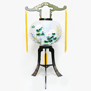 伝統的な提灯の中でも、やや大きめの回転提灯です。 菊が一面に咲いた垣根の足元に、桔梗が顔をのぞかせた、美しい絵柄の提灯です。 雲手や脚にも装飾をほどこし、華やかな印象です。 回転筒を内部に取り付けることで筒が回りだし、お盆らしい独