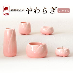 【やわらぎ さくら 5点セット】 【商品説明】 ・国産 ・かわいらしい陶器の仏具セット ・お線香は寝かせて入れられる長香炉タイプ ・コンパクトサイズ。 ・火立、花立、香炉、仏器、湯呑の5点セット。 (仏器は...