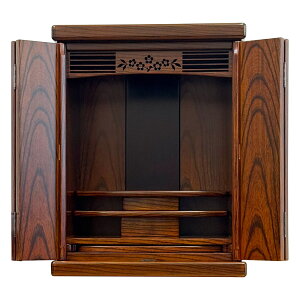 外寸法:高さ61cm×巾48cm×奥行38cm内部寸法:上段から天井までの高さ27cm材質:紫檀系(グラナディロ)正面表面材:笠・台輪−紫檀系(グラナディロ)厚板貼り 戸板−紫檀系(グラナディロ)無垢 大戸軸−紫檀...