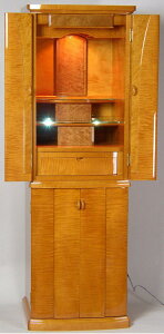 外寸法:高さ125cm×巾41cm×奥行40cm 内部寸法:上段から天井までの高さ32cm 下台収納スペース:高さ42cm×巾35cm×奥行35.5cm 材質:バーズアイメープル材 正面表面材:笠・台輪−バーズアイメープル薄板貼り<