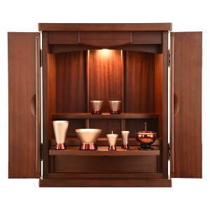 ウォールナット調の落ち着いた色合いのお仏壇と基本的なお仏具をセットにしました。中の棚が取り外せる造りになっているため、お仏像やお位牌様のサイズに合わせて高さを調節できます。内部にはLED照明が付いていて、ご本尊様...