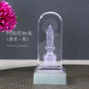 刻したお仏像です。淡い白色の優しいお姿が浮かんでいるように見えます。虹色にクリスタルを照らし出すLEDスタンドライト付属。