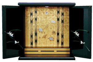 品のある光沢と、色鮮やかな蒔絵が特徴的な美しい小型仏壇。上品な【黒漆色】です。金箔格子や彫刻など細部に渡り、巧みの技が光ります。