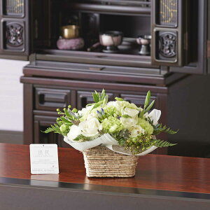 お供え花(供花)にスタイリッシュさを加えたモダンな白バラアレンジメント花自宅葬 法事 法要 年忌法要 一周忌 三回忌 七回忌 お盆 新盆 お彼岸 お墓参り お悔やみ